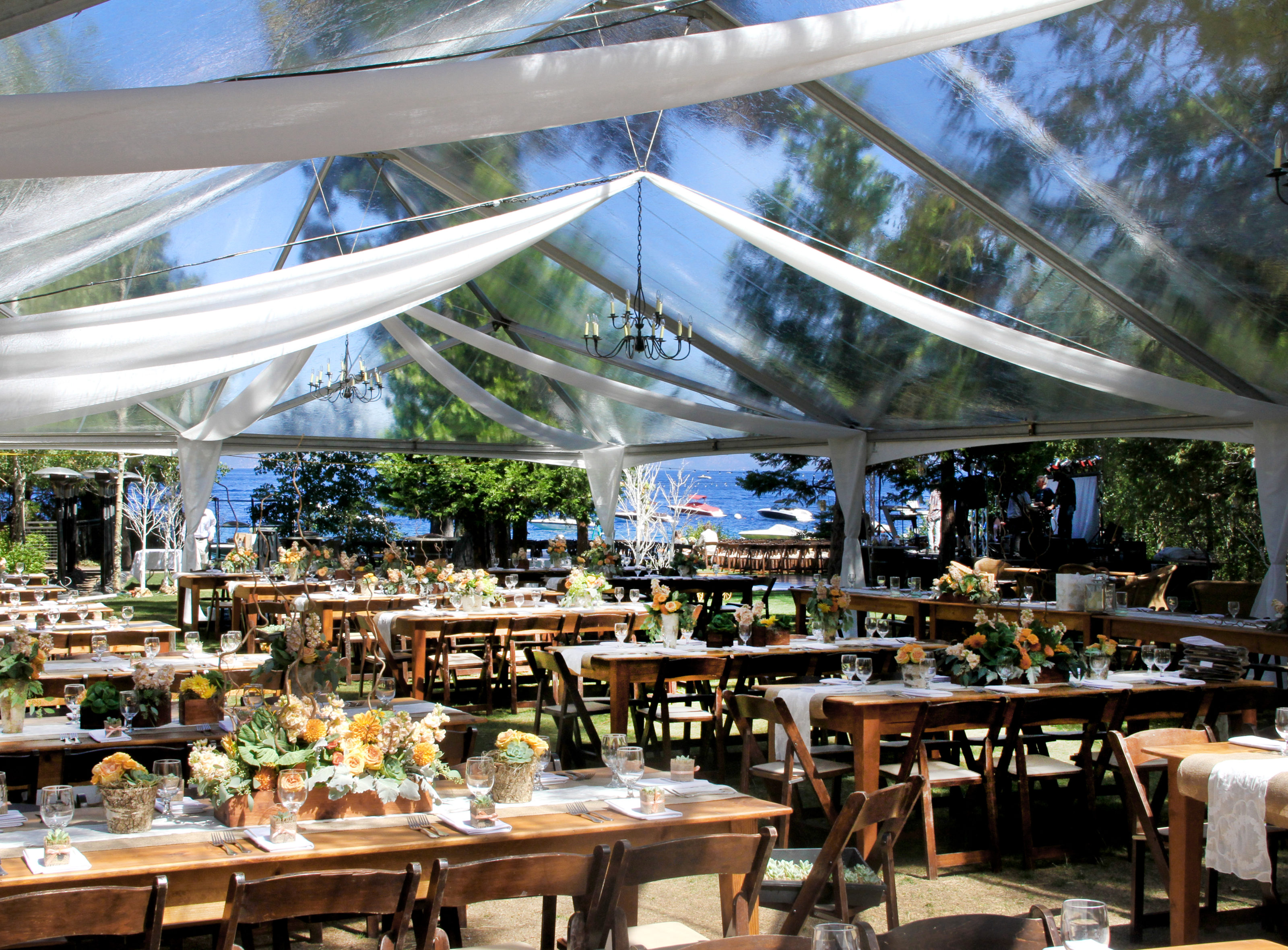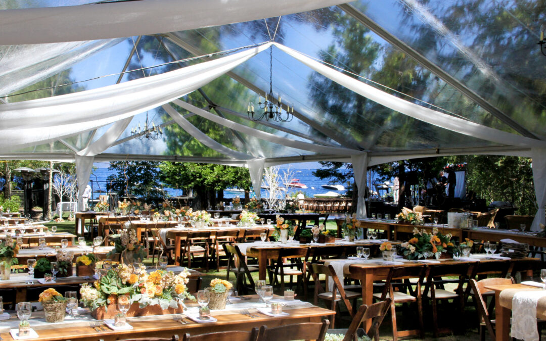 The West Shore Cafe Lawn is set for a dinner reception. There are wooden farm tables with white linens and orange flowers. A large white tent covers the area. Lake Tahoe is in the background.