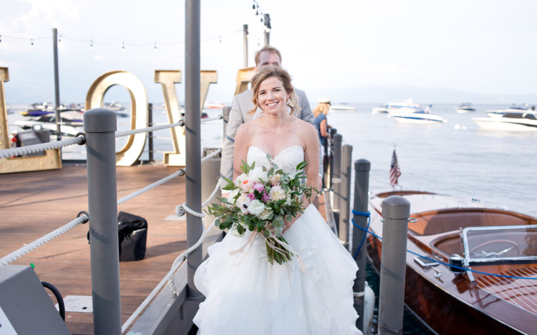 A bride stands on the West Shore Cafe Pier holding a bouquet of flowers. The groom stands behind her. A wooden boat is in the background. Sandra Fazzino Photography