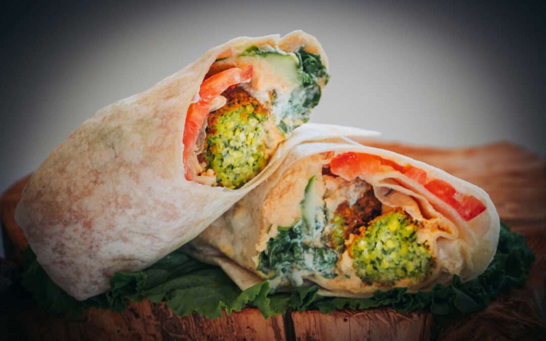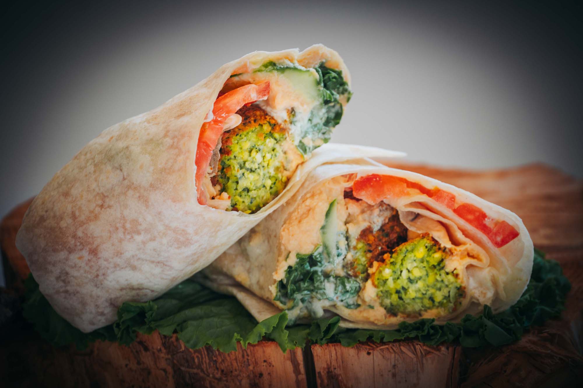 falafel fritters, chick pea hummus, lettuce, tomato, cucumber, yogurt sauce